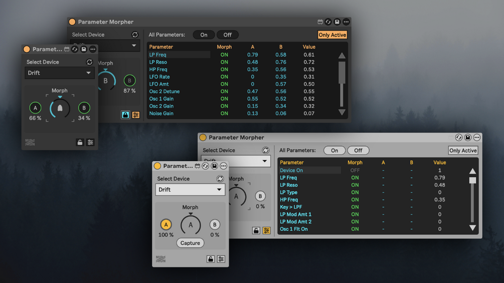 Works with instruments, audio effects, midi effects and third party plugins. Morph between presets without losing A/B snapshots or per-parameter on/off within the session. -