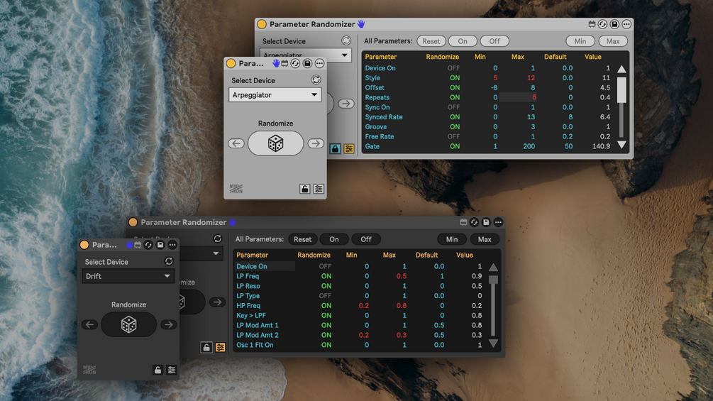A utility device for Ableton Live that lets you randomize and tweak parameters across multiple devices on the same track. Designed for both quick experimentation and precise control, with history, editing, and safety features built in.